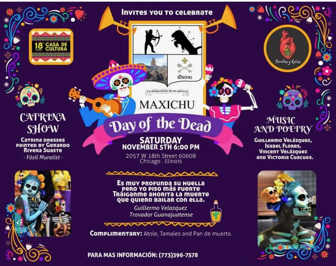 MAXICHU DIA DE MUERTOS - CATRINA SHOW Saturday, November 5, 2022 6:00 PM 9:00 PM 18th Street Casa de Cultura 2057 W. 18th Street Chicago, IL, 60608 USA (map) Google Calendar ICS